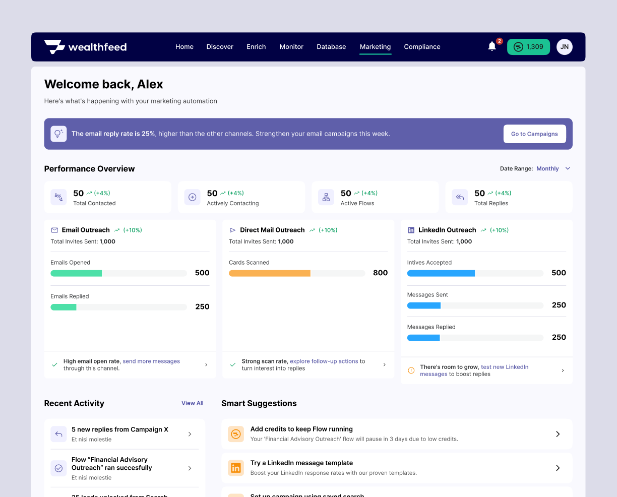 Leveraging advanced AI and data analytics, WealthFeed empowers financial advisors and insurance agents to identify and connect with high-quality prospects experiencing money-in-motion. The platform’s suite of features includes a robust Discovery data feed, Person Enrich, Client Monitoring, and Marketing Hub, offering a comprehensive solution for streamlined and effective client acquisition.