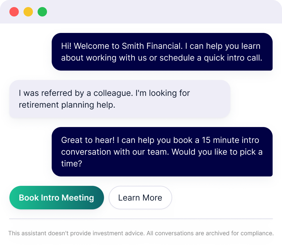See how the WealthFeed AI Concierge can increase introductory meetings from your existing website traffic without adding compliance risk.